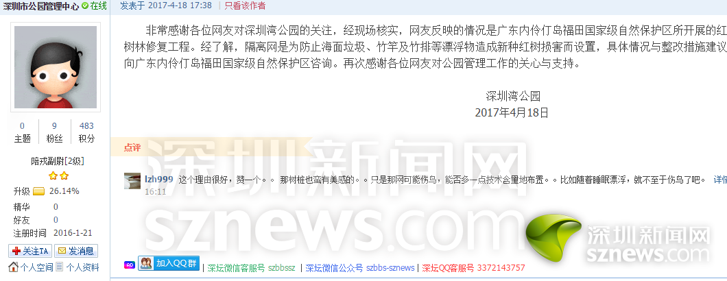 深圳灣公園在4月18日下午就網(wǎng)友質疑,迅速在深圳論壇中回應