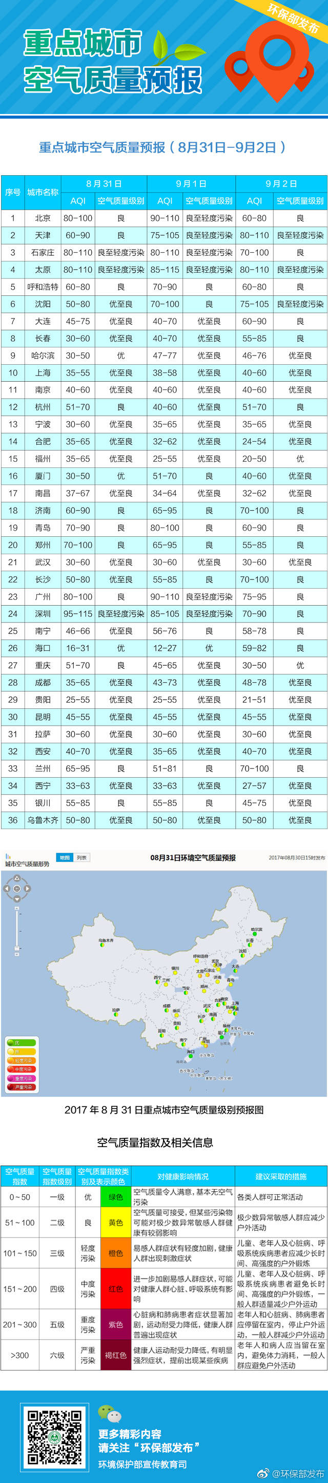 環(huán)保部宣傳教育司微博發(fā)布的空氣質(zhì)量分級及應(yīng)對措施。