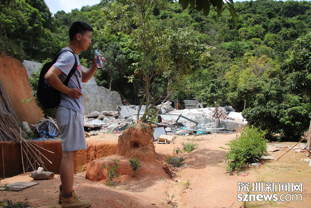 5月16日,深圳新聞網記者爬上羊臺山,用無人機和相機拍下羊臺山毀林案件涉案的兩棟違法建筑拆除后的情景。記者從羊臺山隱蔽的一處登山,山路崎嶇且陡峭,沿路都是荔枝林,多頭大型犬見到陌生人狂吠不已。耗時三四十分鐘登臨山腰,可俯瞰西麗水庫,視野極佳。