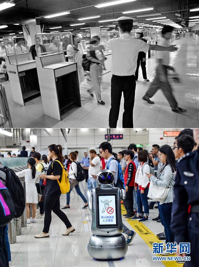 拼版照片:上圖為旅客經(jīng)過(guò)深圳羅湖口岸(資料照片,新華社記者陳小波攝);下圖為2018年4月6日,在深圳灣口岸出境大廳,機(jī)器人在自助查驗(yàn)通道前對(duì)旅客進(jìn)行提示(新華社記者毛思倩攝)。新華社發(fā)
