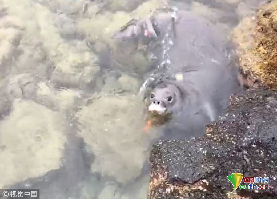自然資源部的發(fā)言人稱它在近岸的巖石下發(fā)現了這個橙色小刀。一位工作人員說他很擔心小海豹會吞下刀,他還提醒我們要妥善處理垃圾,不要隨意丟棄在海灘上或者海里。