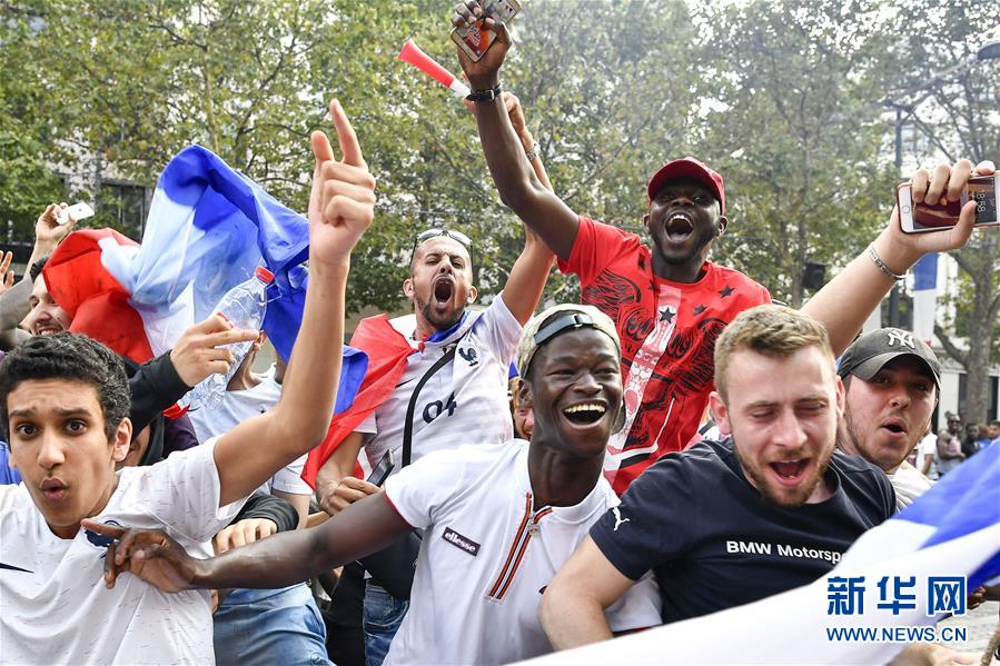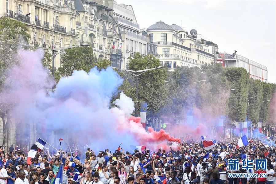 7月15日,法國球迷在巴黎香榭麗舍大街上慶祝法國隊奪冠。