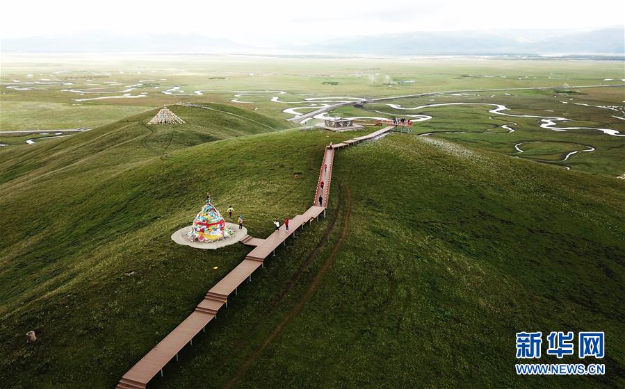 游客在瑪曲縣阿萬(wàn)倉(cāng)濕地的觀景步道上游覽(7月31日無(wú)人機(jī)拍攝)。新華社記者 陳斌 攝