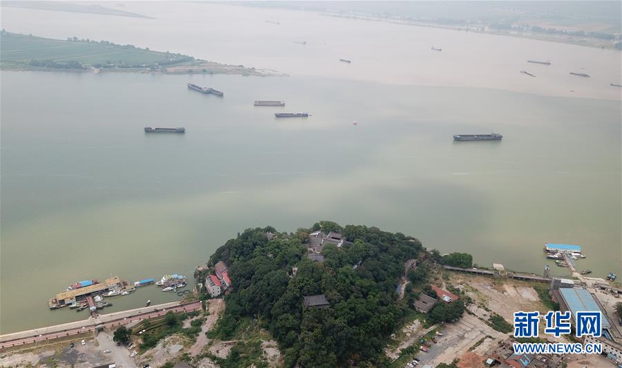 長(zhǎng)江和鄱陽(yáng)湖在江西省九江市湖口縣石鐘山附近交匯,形成江湖兩色美景(8月5日無(wú)人機(jī)拍攝)。 新華社記者 金立旺 攝