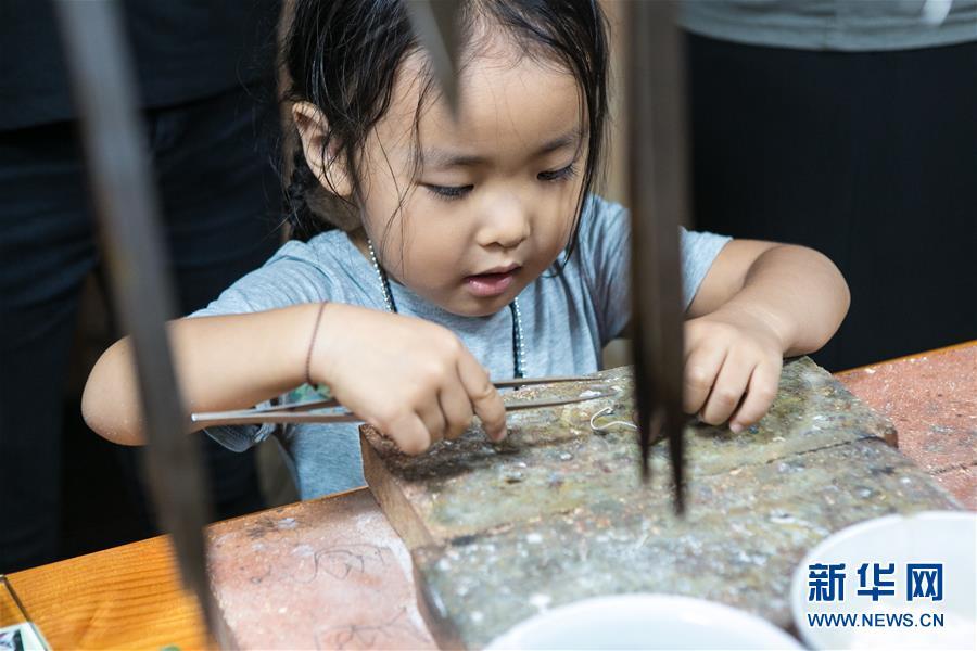 8月3日,來(lái)自西安的小朋友月白在龍?zhí)?yáng)銀飾體驗(yàn)工作室中學(xué)習(xí)制作銀飾。
