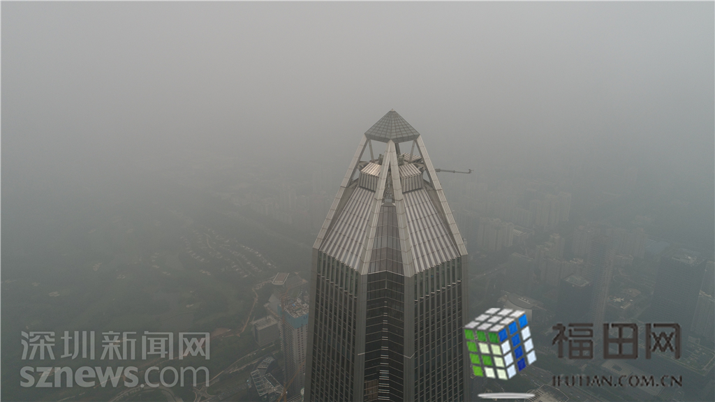 記者在福田中心區(qū)看到,大量的灰霾籠罩在城市上空,不少著名的地標(biāo)性高樓大廈玩起了“隱身術(shù)”。比如,平安金融中心大廈若隱若現(xiàn),在上午11時、下午4時等灰霾最嚴重時候甚至完全看不見。記者操作無人機航拍福田中心區(qū)的灰霾情況,在海拔500米左右的高空,無人機的視線就被灰霾完全擋住。距離不足一百米的平安金融中心都看不見任何蹤影。