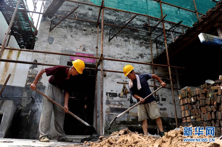 工人在對(duì)安徽涇縣黃田古村落一處古民居進(jìn)行修復(fù)施工(2014年7月10日攝)。