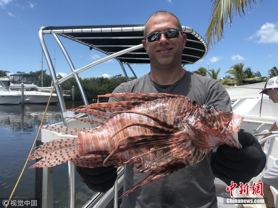 8月21日訊(具體拍攝時間不詳),近日,來自長島的Timothy Blasko打破了記錄,他捕獲了大西洋最重的獅子魚。37歲的Timothy Blasko是一名技術精湛的捕魚者,當天,他和朋友們在佛羅里達群島伊斯拉莫拉達海岸捕魚時,遇到了這條大魚。Timothy向朋友要來了魚叉,瞄準大魚的下方位置叉去,正中目標成功捕獲。當他們把這條魚和當天捕獲的其它魚排在一起時,他們猜測這條魚可能會破紀錄?!八喼笔仟{子魚中的哥斯拉!” Timothy描述道,“這條巨大的獅子魚重達3.1磅,刷新了大西洋迄今最重獅子魚的國家紀錄?!眻D片來源:視覺中國
