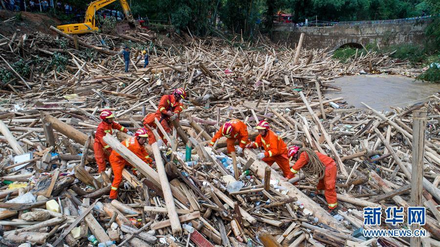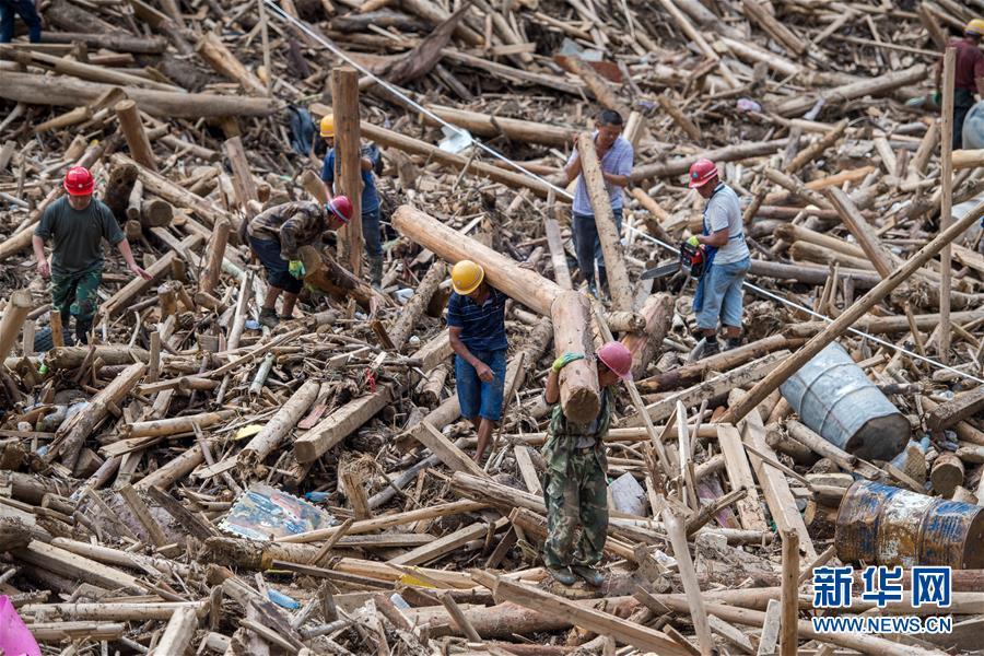 9月4日,當?shù)厝罕娫诼槔跗驴h猛硐瑤族鄉(xiāng)壩子橋區(qū)域清理河道內(nèi)堆積的木材。當日,云南麻栗坡山洪泥石流災(zāi)害救援工作繼續(xù)開展,救援人員在現(xiàn)場全力搜尋失蹤人員。新華社發(fā)方超 攝 圖片來源:新華網(wǎng)