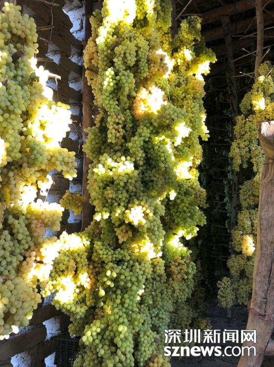 鏤空的土磚房具有良好的通透性,把葡萄搭在干樹枝上一層層碼起來(lái)高達(dá)屋頂,慢慢就會(huì)失去水分自然晾成葡萄干了。趙春麗攝