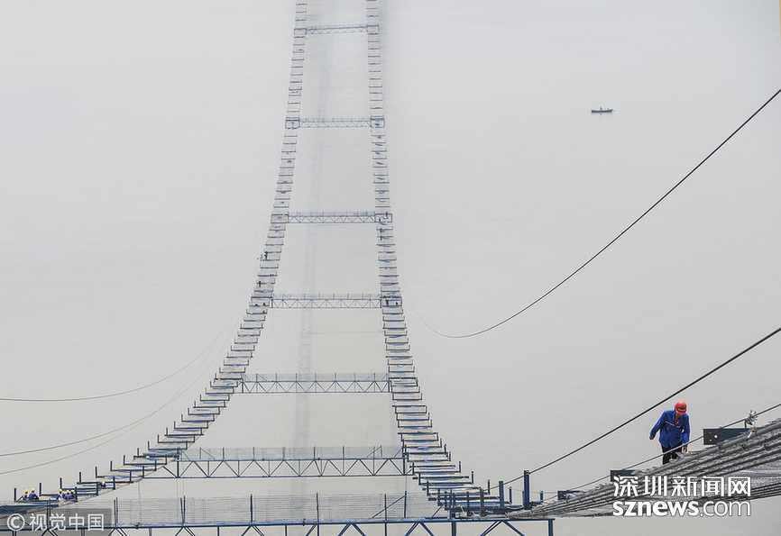???? 14日11時許,記者在228.8米高空建設(shè)現(xiàn)場感受到,高空風(fēng)力在6級上下,中跨、邊跨施工便道現(xiàn)場一片忙碌景象:班組長雷承易帶著10余名工人或在用扳手錨緊貓道面網(wǎng)的扶手繩,或在鋪設(shè)鐵絲防護網(wǎng)……