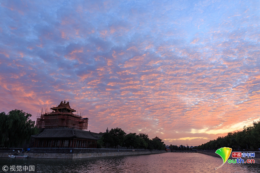 2018年9月5日,北京迎晴好天氣,傍晚時(shí)分,落日晚霞美不勝收。天空出現(xiàn)美麗的火燒云,映照故宮博物院角樓。圖片來(lái)源:視覺中國(guó)