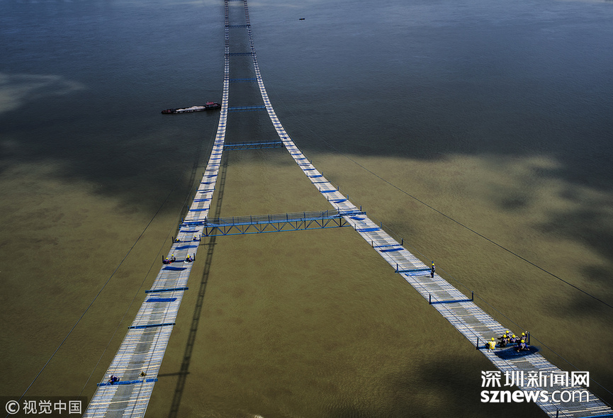2018年5月14日,武漢,武漢楊泗港長江大橋上空,上部結構施工進入貓道面網鋪設階段,數(shù)十名中鐵大橋局工人在跨江高空拼搏趕超,江面上空的臨時“吊橋”悄然形成。數(shù)十名工人在長江上空228米處拼搏趕超,臨時“天梯”悄然形成。