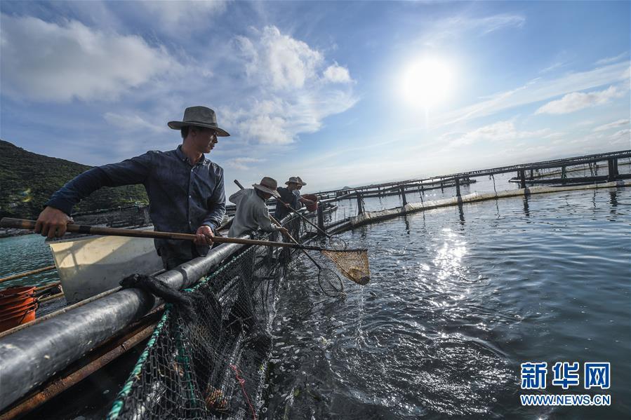 8月18日,南麂島海域內(nèi)的“海上牧場”養(yǎng)殖區(qū)內(nèi),漁民正捕撈大黃魚,處于仿生養(yǎng)殖環(huán)境的大黃魚需要生長2至3年。進入8月,浙江省溫州市平陽縣南麂鎮(zhèn)海域上大片的大黃魚、貽貝等特色海產(chǎn)品養(yǎng)殖區(qū)域迎來豐收季節(jié),養(yǎng)殖戶們駕駛漁船在養(yǎng)殖區(qū)海域進行打撈收獲,在碧海藍天下構成了一幅“海上牧場”的美麗豐收景象。近年來,南麂鎮(zhèn)政府引導漁民養(yǎng)殖戶充分發(fā)揮“靠海吃海”的資源優(yōu)勢,大力發(fā)展海洋養(yǎng)殖經(jīng)濟和海島旅游經(jīng)濟,實現(xiàn)了南麂由“生態(tài)美”向“產(chǎn)業(yè)美”,“產(chǎn)業(yè)美”向“經(jīng)濟美”的轉變。同時該鎮(zhèn)堅持以大黃魚、貽貝等為特色產(chǎn)業(yè)支撐,精準發(fā)展高效海洋養(yǎng)殖業(yè),重點培養(yǎng)一批新型職業(yè)漁民,依靠專業(yè)技術支持,實現(xiàn)深海仿生養(yǎng)殖,讓好生態(tài)造就好品質(zhì),重點打造南麂養(yǎng)殖品牌,組建營銷網(wǎng)絡,拓展特色海產(chǎn)品市場。新華社記者 徐昱攝