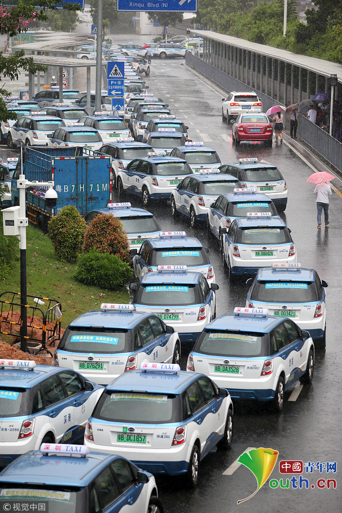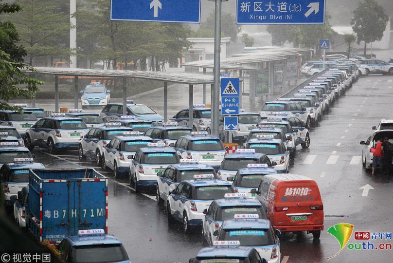 2018年9月16日,受臺風(fēng)山竹影響,全市的電動(dòng)車充電站暫停使用。深圳市民樂P+R停車場外,停滿了等待充電站開門的電動(dòng)出租車。