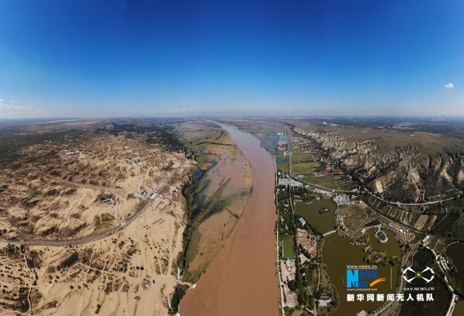航拍黃河托克托段兩岸風(fēng)光,一邊是魚米之鄉(xiāng),一邊是浩瀚沙漠。新華網(wǎng) 張偉 攝