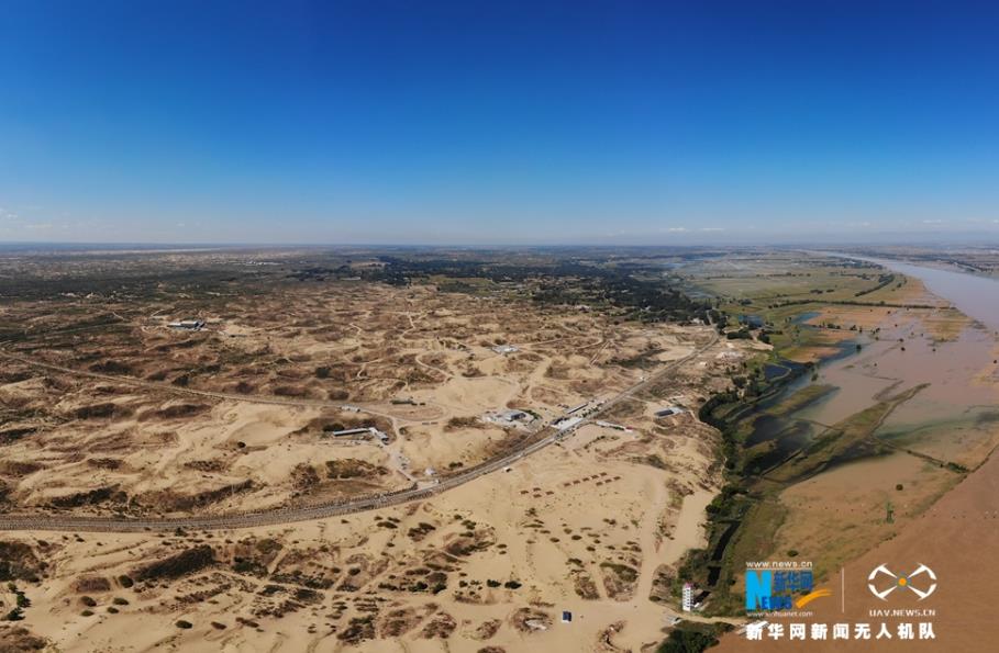 航拍黃河托克托段兩岸風(fēng)光,西案的灘涂與沙漠相連。新華網(wǎng) 張偉 攝