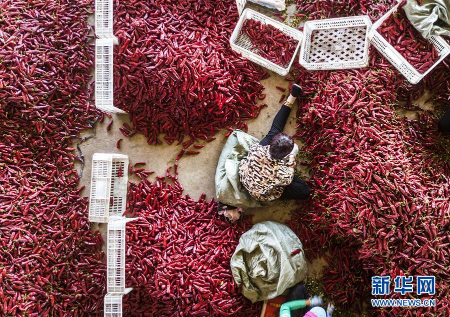 9月19日,在吉林省白城市通榆縣,農(nóng)民在分揀收獲的辣椒。 新華社記者 張楠 攝