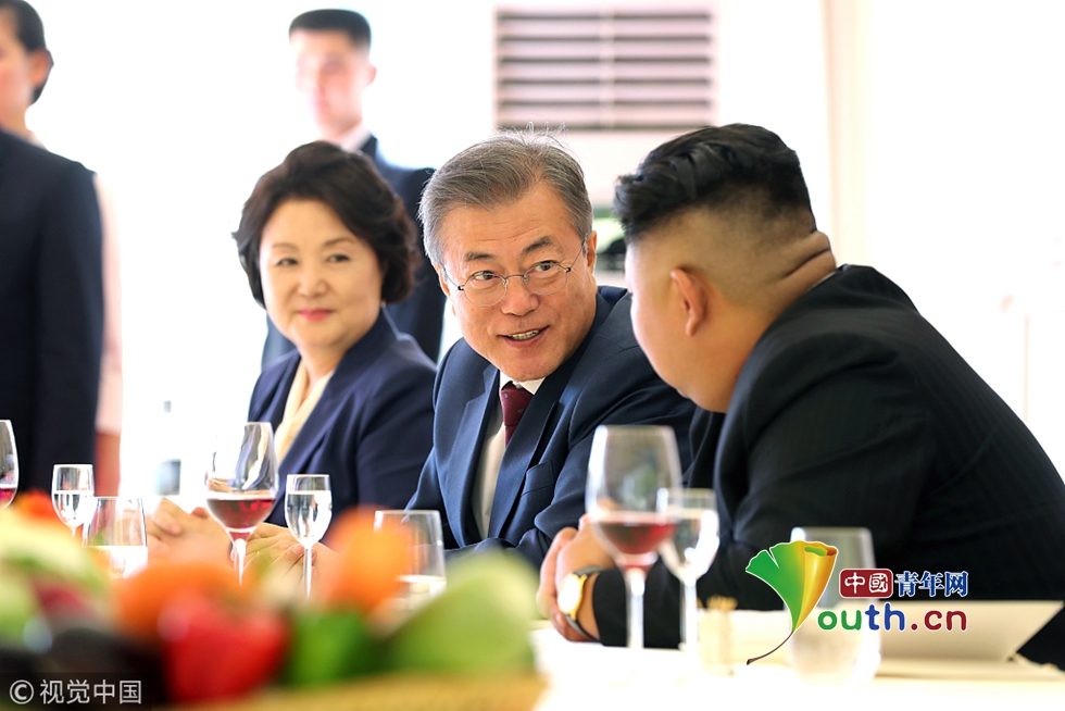 當(dāng)?shù)貢r(shí)間2018年9月20日,朝鮮,韓國(guó)總統(tǒng)文在寅在三池淵招待所和金正恩夫婦一起共進(jìn)午餐。圖片作者:Yonhap News Agency/視覺(jué)中國(guó)