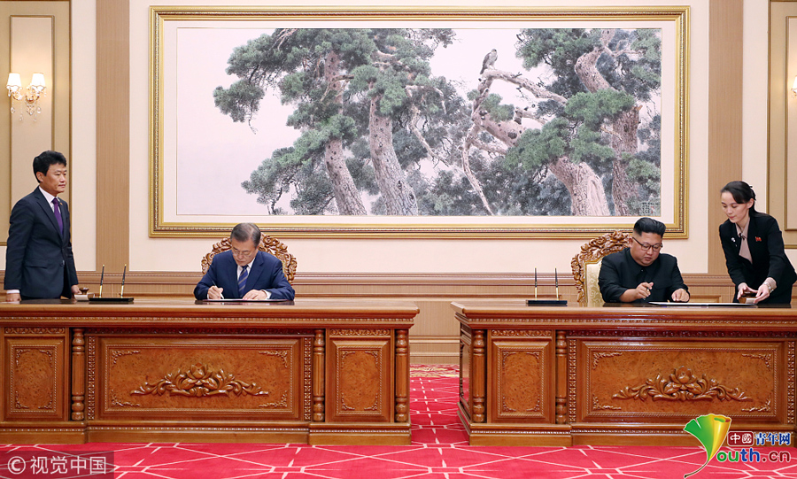 朝鮮最高領(lǐng)導(dǎo)人金正恩和韓國總統(tǒng)文在寅舉行第三次會(huì)晤的第二輪首腦會(huì)談。圖片作者:Yonhap News Agency