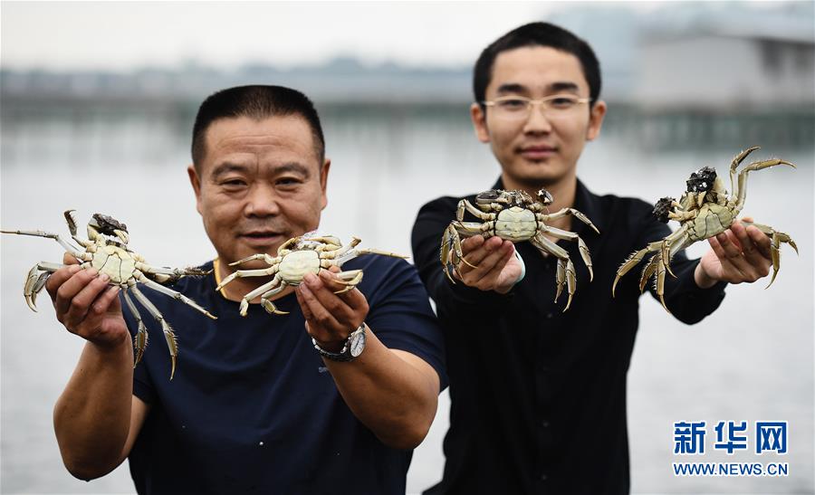 9月21日,蟹農(nóng)展示剛捕撈到的陽澄湖大閘蟹。
