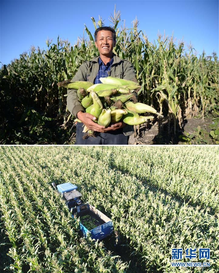 這張拼版照片顯示的是:上圖,9月18日,黑龍江省綏化市青岡縣禎祥鎮(zhèn)莊稼屯村民莊秀彬捧著剛收獲的玉米;下圖,9月18日,莊秀彬駕駛農(nóng)機(jī)收獲玉米(無(wú)人機(jī)拍攝)。 新華社記者王凱攝