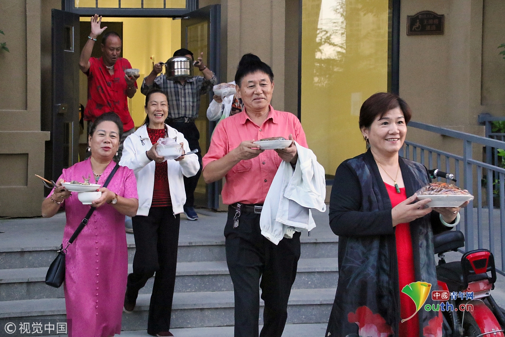 2018年9月23日,在山東省乳山市金鼎銀龍灣小區(qū),居民們端著自家做的菜肴去參加“百家宴”。