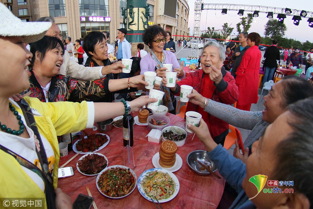 2018年9月23日,居民們在山東省乳山市金鼎銀龍灣廣場參加“百家宴”。