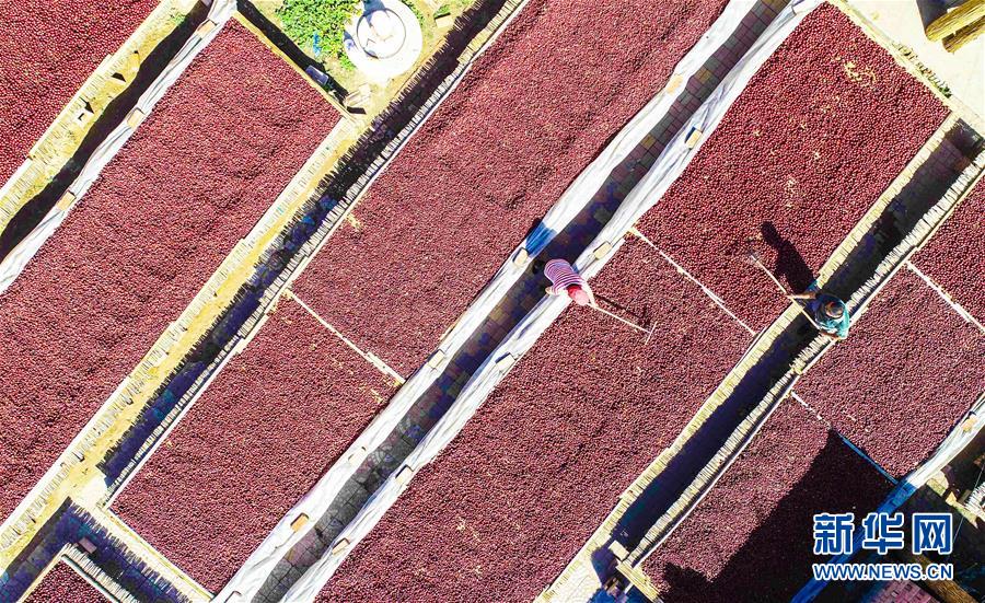 9月22日,河北省棗強縣棗強鎮(zhèn)孟家莊村的棗農在晾曬紅棗(無人機拍攝)。 近日,河北省棗強縣的2000多畝棗園迎來收獲季,棗農們搶抓農時,采摘、篩選、晾曬紅棗,樂享秋收的快樂。 新華社記者李曉果攝