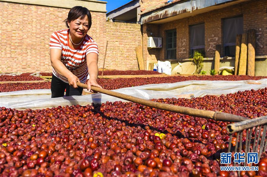 9月22日,河北省棗強(qiáng)縣棗強(qiáng)鎮(zhèn)孟家莊村的棗農(nóng)在晾曬紅棗。 近日,河北省棗強(qiáng)縣的2000多畝棗園迎來收獲季,棗農(nóng)們搶抓農(nóng)時,采摘、篩選、晾曬紅棗,樂享秋收的快樂。 新華社記者李曉果攝