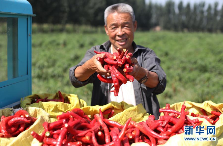 9月16日,阜城縣王集鄉(xiāng)南張莊村農(nóng)民在展示采摘的辣椒。近年來,河北省阜城縣王集鄉(xiāng)在推進(jìn)產(chǎn)業(yè)富民過程中,積極引導(dǎo)農(nóng)民調(diào)整農(nóng)業(yè)產(chǎn)業(yè)結(jié)構(gòu),按照品種特色化、種植規(guī)?;?、產(chǎn)銷一體化的“公司+基地+農(nóng)戶”的經(jīng)營模式,鼓勵農(nóng)民發(fā)展特色辣椒種植,推行“訂單種植”模式,開辟出了一條農(nóng)民創(chuàng)收新路徑。目前,阜城縣王集鄉(xiāng)辣椒種植面積3100余畝,每畝年收益2500元以上,帶動當(dāng)?shù)剞r(nóng)民實現(xiàn)增收。新華社記者朱旭東攝