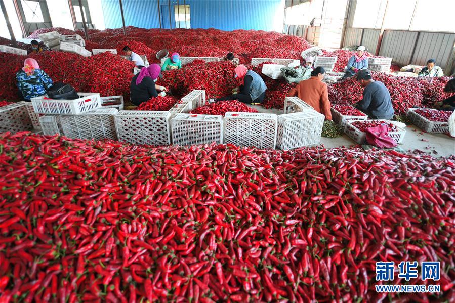 9月19日,在吉林省白城市通榆縣,農(nóng)民在分揀收獲的辣椒。 新華社記者 張楠 攝
