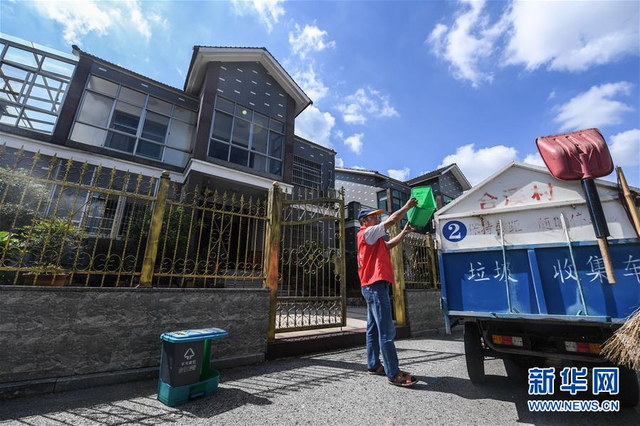 9月27日,小浦鎮(zhèn)合溪村垃圾分類清運(yùn)員符正芳在清運(yùn)村民門(mén)口的分類垃圾桶,同時(shí)他還要用手機(jī)上的垃圾分類APP進(jìn)行掃碼簽到,確保每天每戶清掃到位。從9月初開(kāi)始,浙江省長(zhǎng)興縣小浦鎮(zhèn)推廣使用手機(jī)垃圾分類智能管理平臺(tái)。通過(guò)這款A(yù)PP可以進(jìn)行村民垃圾分類情況打分、清運(yùn)員每日簽到、監(jiān)督員巡查等,并能即時(shí)生成農(nóng)戶垃圾分類“成績(jī)單”,所有農(nóng)戶均可通過(guò)APP查詢垃圾分類排行榜,既方便又環(huán)保。新華社記者 徐昱 攝