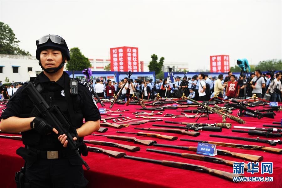 9月20日,在河北省邯鄲市天鴻廣場,警方展示即將銷毀的非法槍支。 新華社記者 王曉 攝