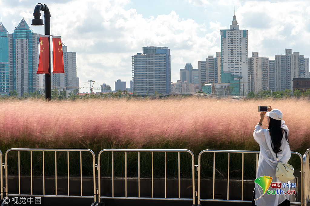 2018年9月28日,上海,東外灘楊浦濱江的粉黛亂子草目前已進(jìn)入盛花期,當(dāng)日早間,不少市民來到濱江拍照賞景,成片的紫色花海在藍(lán)天白云映襯下美不勝收。圖片作者:王岡/視覺中國(guó)
