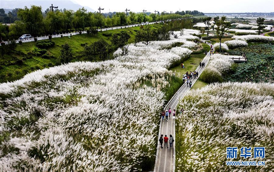 9月28日,人們在蘆花盛開的漢江濕地公園里游覽(無人機(jī)拍攝)。新華社記者陶明 攝