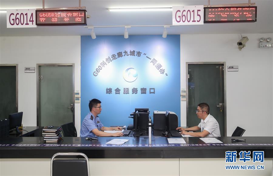 這是上海市松江區(qū)行政服務(wù)中心內(nèi)的G60科創(chuàng)走廊九城市“一網(wǎng)通辦”綜合服務(wù)窗口(9月28日攝)。新華社記者 丁汀 攝
