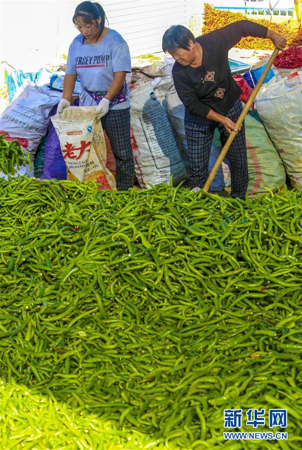 9月28日,饒陽縣留楚鄉(xiāng)影林村的種植戶在將辣椒裝袋。 近年來,河北省饒陽縣結(jié)合市場需求,積極引進特色品種辣椒種植,開辟出一條農(nóng)民增收致富新路。目前,該縣特色辣椒種植面積1000余畝,種植戶年均增收3000余元。 新華社記者 李曉果攝