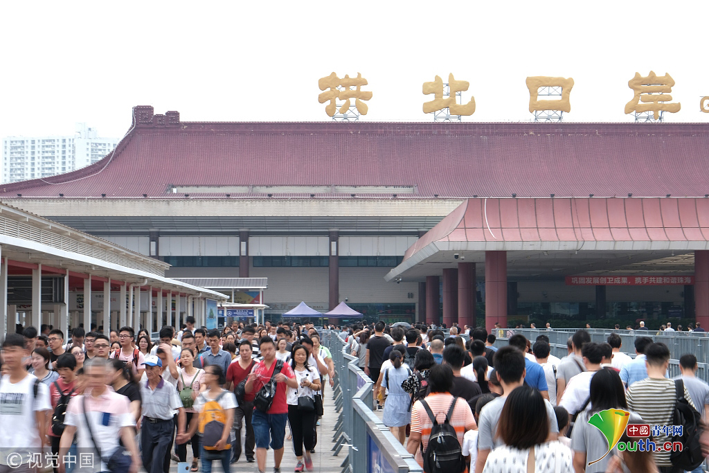 2018年10月1日國(guó)慶節(jié),珠海拱北口岸迎來第一波過關(guān)的民眾,拱北口岸是中國(guó)人流量最大的陸地通關(guān)口岸。圖片作者:潘力