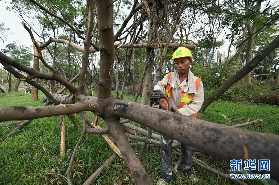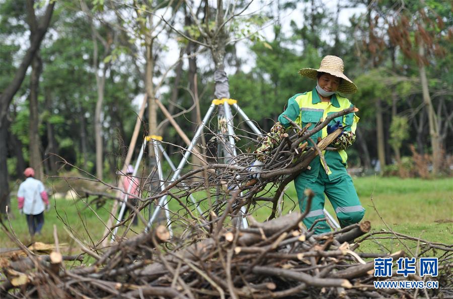 10月1日,工作人員在深圳街頭的綠化帶清理強(qiáng)臺(tái)風(fēng)“山竹”損毀的樹木。當(dāng)日是國慶節(jié),許多勞動(dòng)者堅(jiān)守在工作一線,在崗位上度過節(jié)日。新華社記者毛思倩攝