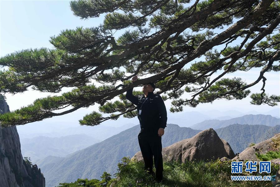 10月1日,安徽黃山風(fēng)景區(qū)管委會(huì)園林局迎客松專職守護(hù)人胡曉春在對迎客松進(jìn)行巡查。當(dāng)日是國慶節(jié),許多勞動(dòng)者堅(jiān)守在工作一線,在崗位上度過節(jié)日。新華社記者張端攝