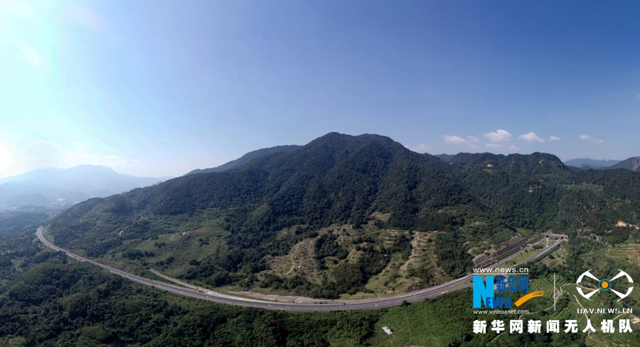 這是改擴(kuò)建工程施工之后的風(fēng)霜嶺隧道外景觀。道路拓寬,坡度平緩(無(wú)人機(jī)拍攝)。新華網(wǎng) 肖和勇 攝