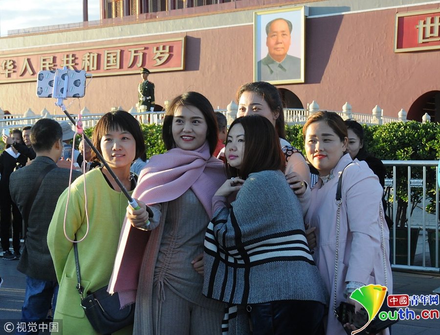 游客著秋冬裝天安門(mén)廣場(chǎng)合影。