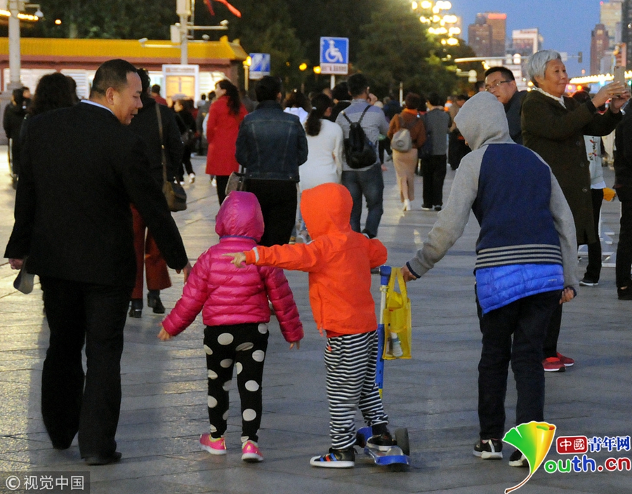 北京冷空氣來(lái)襲。游客紛紛著秋冬裝游覽天安門(mén)廣場(chǎng)。