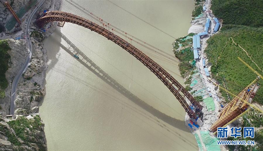 9月28日拍攝的川藏鐵路拉林段重點(diǎn)標(biāo)志性工程藏木特大橋。 當(dāng)日,隨著最后一節(jié)鋼管拱的對(duì)位和鎖定完畢,川藏鐵路拉林段藏木特大橋成功合龍,標(biāo)志著大橋主體結(jié)構(gòu)施工取得了關(guān)鍵性勝利。藏木特大橋由中國(guó)中鐵廣州局集團(tuán)承建,拱高112米,橋橫跨雅魯藏布江峽谷,水深66米。 新華社記者普布扎西攝