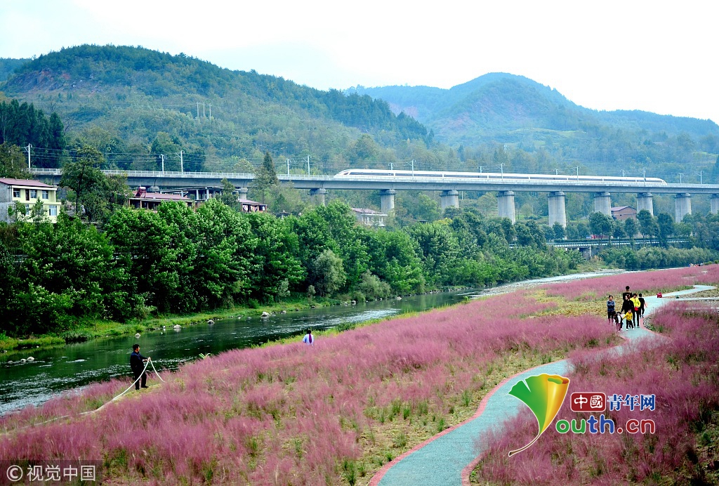 2018年10月14日,陜西漢中,西成高鐵漢中市寧強(qiáng)縣高寨子路段上的一列動(dòng)車正從紅艷艷的蘆葦花海附近駛過。