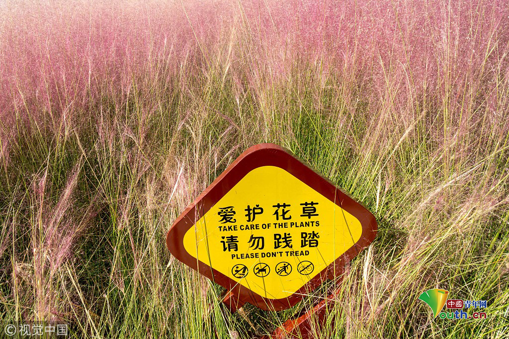 當(dāng)?shù)貢r間2018年10月16日,韓國蔚山,近日,蔚山公園大片粉黛亂子草盛開,粉紅花海浪漫十足,但部分花海遭游客隨意踩踏。公園并沒有修復(fù)遭破壞區(qū)域,而是用繩索圍起并掛上批判性告示,呼吁游客腳下留情。圖片作者:Yonhap News Agency