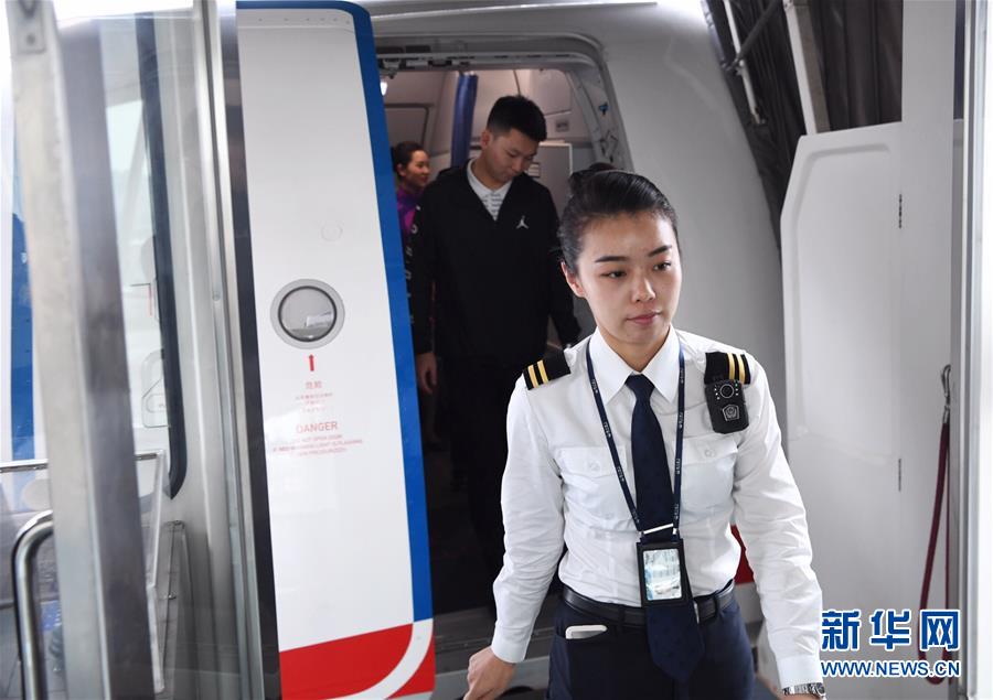 10月16日,航班抵達(dá)重慶江北國際機(jī)場后,湯春燕第一個走出艙門,準(zhǔn)備迎接旅客下機(jī)。 新華社記者王全超攝