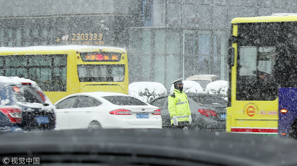 2018年10月18日,在烏魯木齊西大橋,交警冒雪指揮交通。圖片作者:張秀科/視覺(jué)中國(guó)