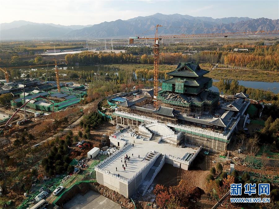 10月18日拍攝的建設(shè)中的北京世園會(huì)永寧閣(無人機(jī)拍攝)。 新華社記者 羅曉光 攝